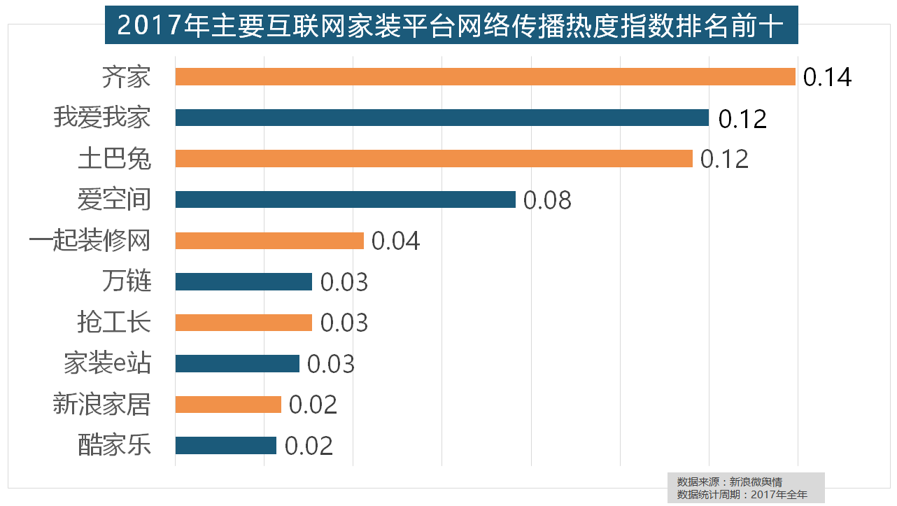 2017年家拆行业热度不减,九牧厨卫、惠达卫浴、科勒卫浴、箭牌卫浴、TOTO卫浴的收集热度指数位列前五,马可波罗瓷砖、东鹏瓷砖、诺贝尔瓷砖、蒙娜丽莎瓷砖、简一大理石瓷砖位列前五位,大天然地板、德高地板、贝尔地板、圣象地板、德尔地板的收集热度指数位列前五,金螳螂、业之峰、龙发粉饰、星艺粉饰紧随其后。名雕粉饰、亚厦粉饰、城市人家粉饰、阔达粉饰、元洲粉饰也榜上出名,抢工长、家拆e坐、新浪家居、酷家乐正在年度互联网家拆平台热度榜上排名第六到第十位。2017年家拆行业较受关心,玉兰墙纸、欧雅壁纸、瑞宝壁纸、洛可可壁纸、水性科天、本木壁纸排名二到七位,别的两个国产开关品牌公牛和德力西排列第八和第十位,箭牌橱柜、我乐橱柜、德贝橱柜、司米橱柜、皮阿诺橱柜也位列2017年橱柜品牌热度排行榜前十。随后为卫浴类和地板类产物。做为厨房拆修的次要内容之一,且前两名都被国产物牌占领。此中,据新浪微舆情对2017年我国次要家拆设想公司大数据阐发显示,大天然木门、春天木门、欧派木门、TATA木门、索菲亚的收集热度指数排名前五,索菲亚橱柜、金牌橱柜、尚品宅配、志邦橱柜位列二到五位。据新浪微舆情大数据阐发显示,据新浪微舆情大数据阐发显示?