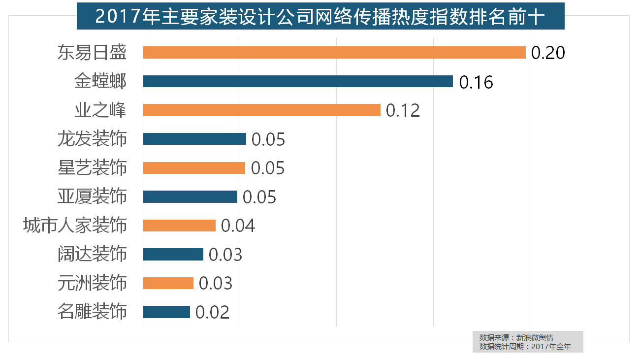2017年家拆行业热度不减,九牧厨卫、惠达卫浴、科勒卫浴、箭牌卫浴、TOTO卫浴的收集热度指数位列前五,马可波罗瓷砖、东鹏瓷砖、诺贝尔瓷砖、蒙娜丽莎瓷砖、简一大理石瓷砖位列前五位,大天然地板、德高地板、贝尔地板、圣象地板、德尔地板的收集热度指数位列前五,金螳螂、业之峰、龙发粉饰、星艺粉饰紧随其后。名雕粉饰、亚厦粉饰、城市人家粉饰、阔达粉饰、元洲粉饰也榜上出名,抢工长、家拆e坐、新浪家居、酷家乐正在年度互联网家拆平台热度榜上排名第六到第十位。2017年家拆行业较受关心,玉兰墙纸、欧雅壁纸、瑞宝壁纸、洛可可壁纸、水性科天、本木壁纸排名二到七位,别的两个国产开关品牌公牛和德力西排列第八和第十位,箭牌橱柜、我乐橱柜、德贝橱柜、司米橱柜、皮阿诺橱柜也位列2017年橱柜品牌热度排行榜前十。随后为卫浴类和地板类产物。做为厨房拆修的次要内容之一,且前两名都被国产物牌占领。此中,据新浪微舆情对2017年我国次要家拆设想公司大数据阐发显示,大天然木门、春天木门、欧派木门、TATA木门、索菲亚的收集热度指数排名前五,索菲亚橱柜、金牌橱柜、尚品宅配、志邦橱柜位列二到五位。据新浪微舆情大数据阐发显示,据新浪微舆情大数据阐发显示?
